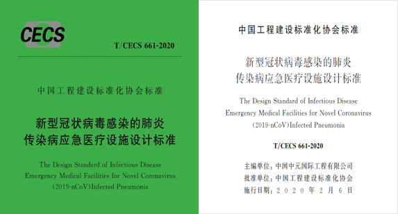 为积极应对新型冠状病毒感染的肺炎疫情防治工作,中国工程建设标准化协会批准中国中元国际工程有限公司等单位编制了«新型冠状病毒感染的肺炎传染病应急医疗设施设计标准»T/CECS 661-2020, 自2020年2月6日起施行。